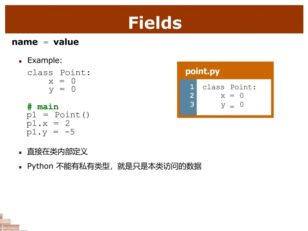 类的字段是存储在对象中的数据。在类定义中,我们可以直接定义类属性,这些属性被所有实例共享。实例属性通常在构造函数中定义,每个实例有自己的副本。Python不强制封装,所有属性都是公开的。按照约定,以下划线开头的属性被视为非公开的,但这只是一种约定,Python不会阻止访问这些属性。这种设计哲学体现了"我们都是成年人"的理念,信任程序员会负责任地使用这种自由。