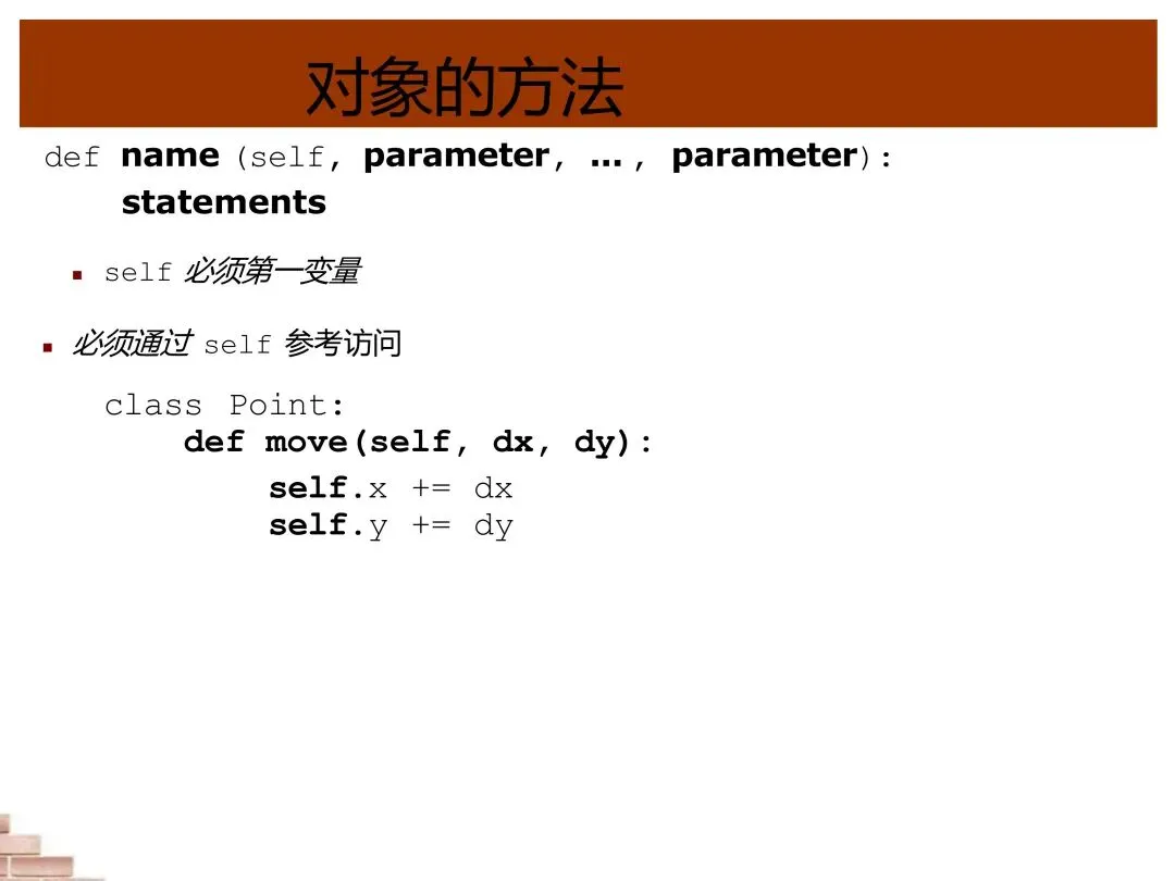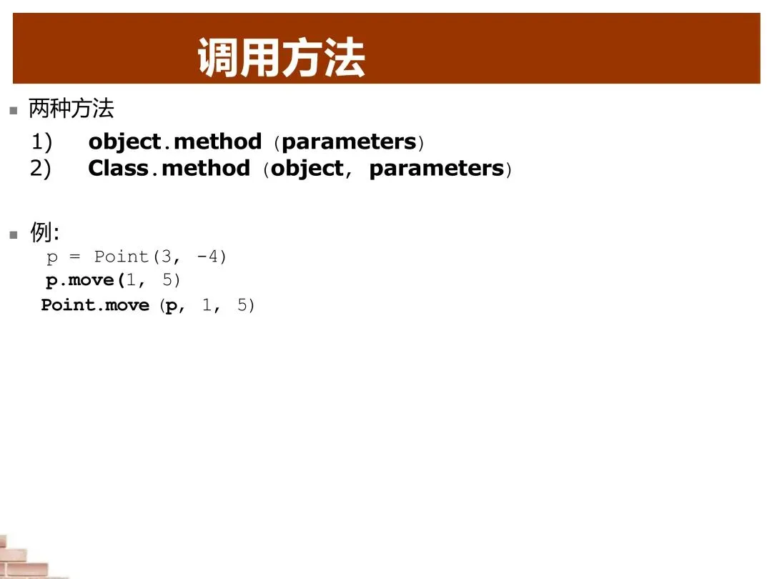 调用方法有两种语法:对象.方法(参数)和类.方法(对象,参数)。第一种更常见,更符合面向对象风格;第二种揭示了方法的本质——它只是一个函数,第一个参数是对象实例。理解这种等价性有助于理解Python的方法机制。当我们看到p.move(1,5)时,Python实际上将其转换为Point.move(p,1,5)。这种透明性使Python的OOP模型既简单又强大。