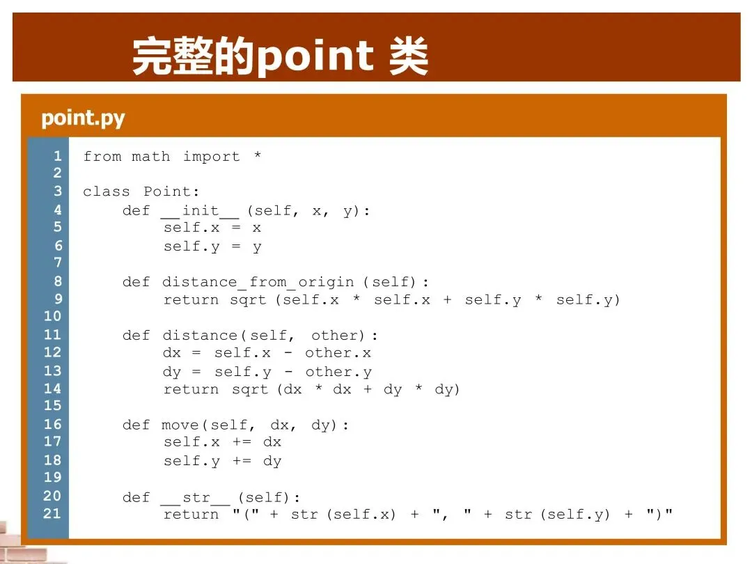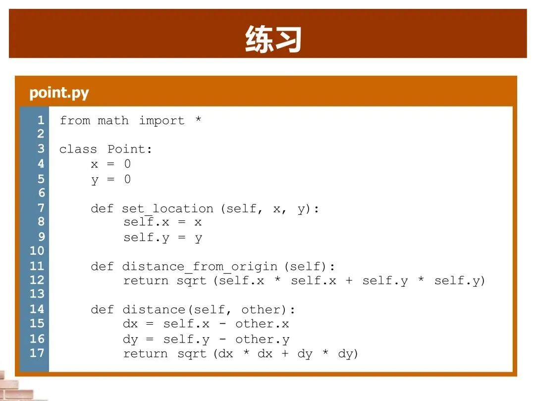 让我们通过一个完整的Point类来看方法的实际使用。Point类有set_location方法设置坐标,distance_from_origin方法计算到原点的距离,distance方法计算到另一个点的距离。这些方法展示了如何将相关操作组织在一起。良好的类设计将数据和对数据的操作封装在一起,减少了代码的耦合性,提高了可维护性。