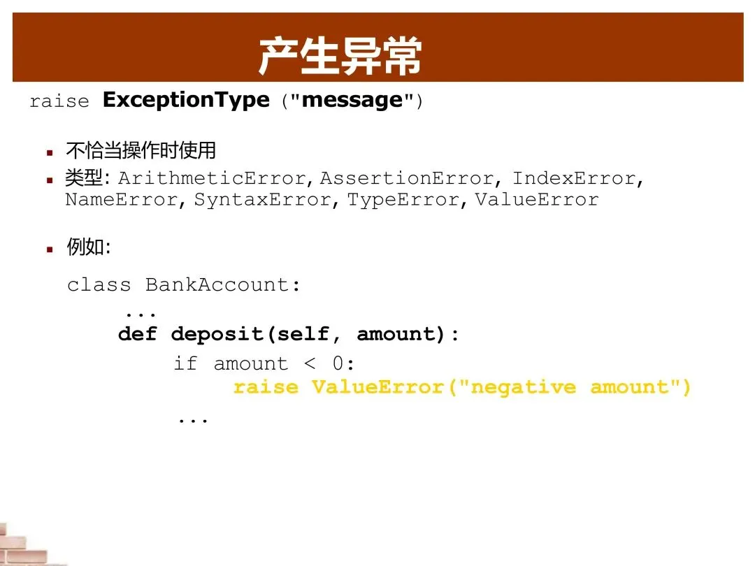 当操作无法完成时,方法应该引发异常而不是静默失败。Python使用raise语句引发异常。异常是对象,包含错误信息。内置异常类型包括ValueError(无效值)、TypeError(错误类型)、IndexError(无效索引)等。我们可以定义自己的异常类型,继承Exception类。正确的异常处理使程序更加健壮,能够优雅地处理错误情况。