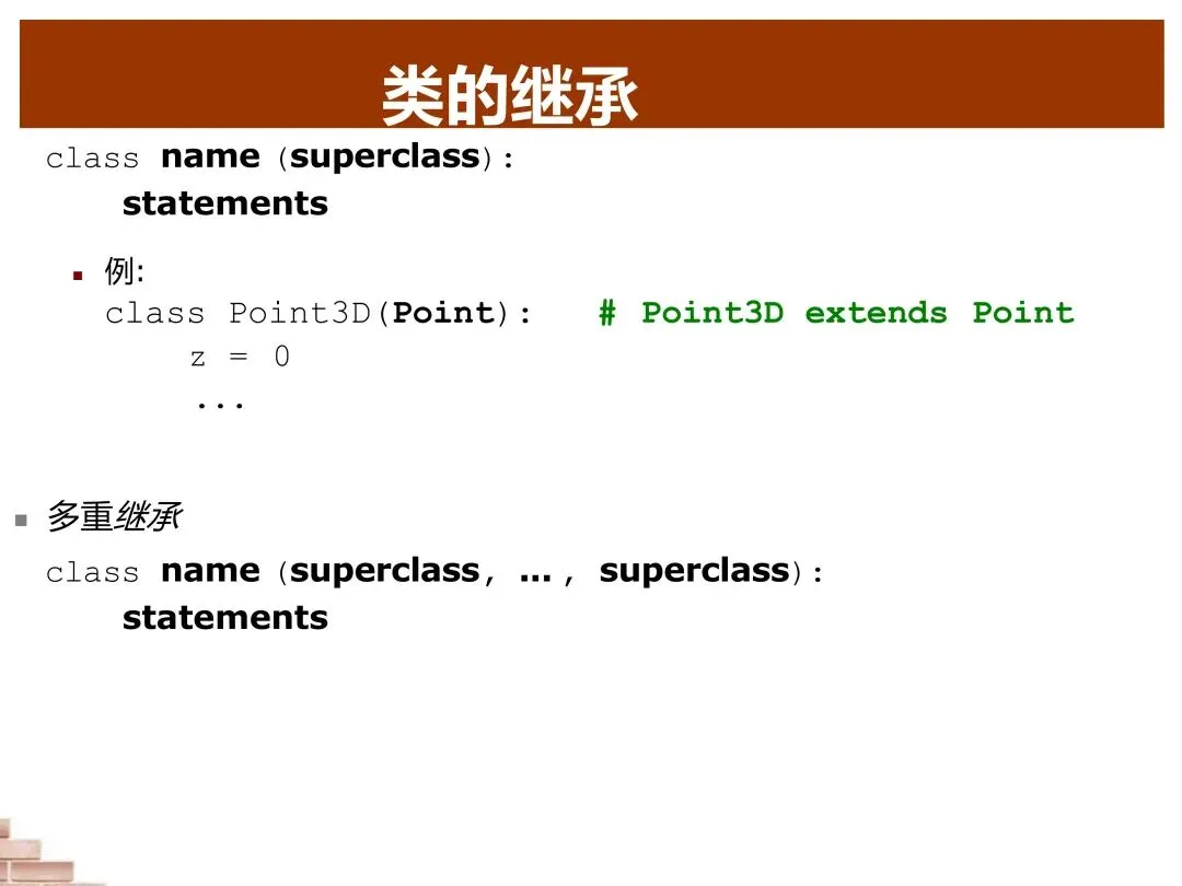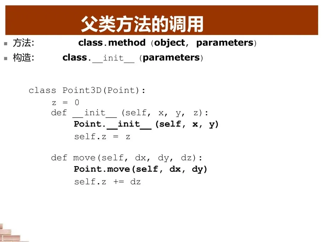 在子类中,有时需要调用父类的方法。可以直接使用父类名调用,如Point.init(self,x,y)。Python 3还提供了super()函数,它返回父类的代理对象,可以调用父类方法。super()在处理多重继承时特别有用,它按照方法解析顺序(MRO)查找方法。理解MRO对于使用多重继承很重要。调用父类方法使子类可以扩展而不是完全替换父类行为。