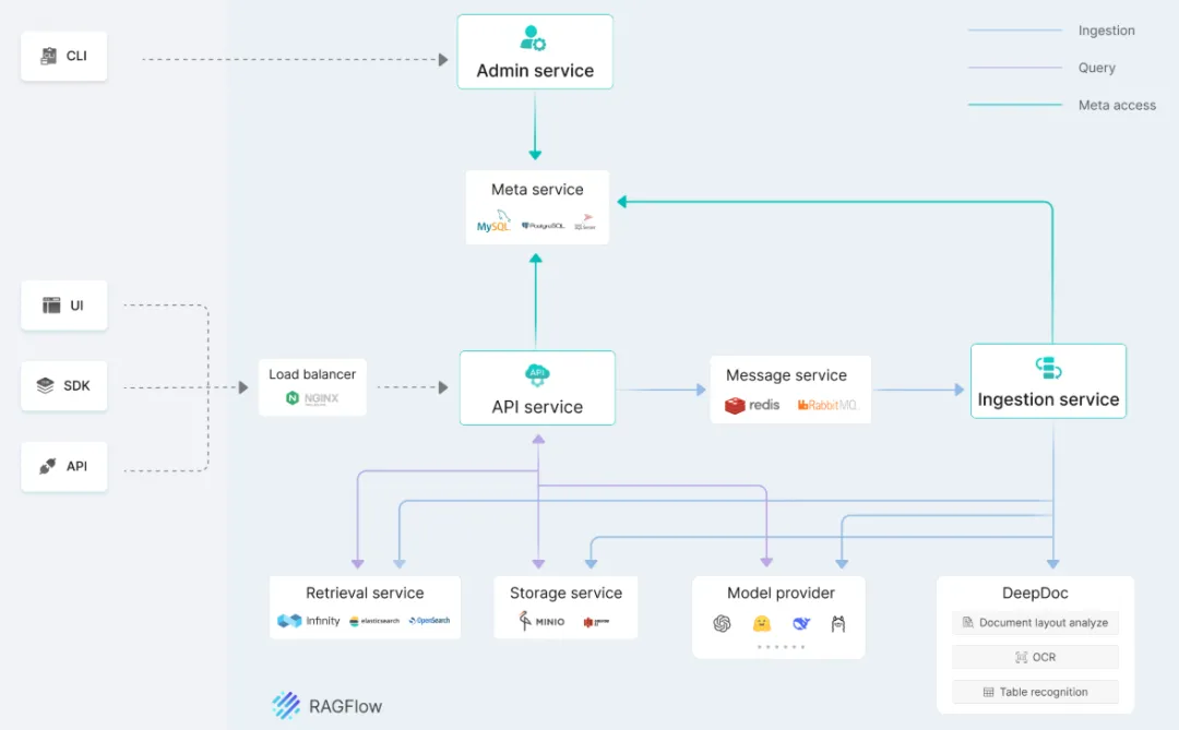 RAGFlow采用微服务架构,主要包含以下模块: