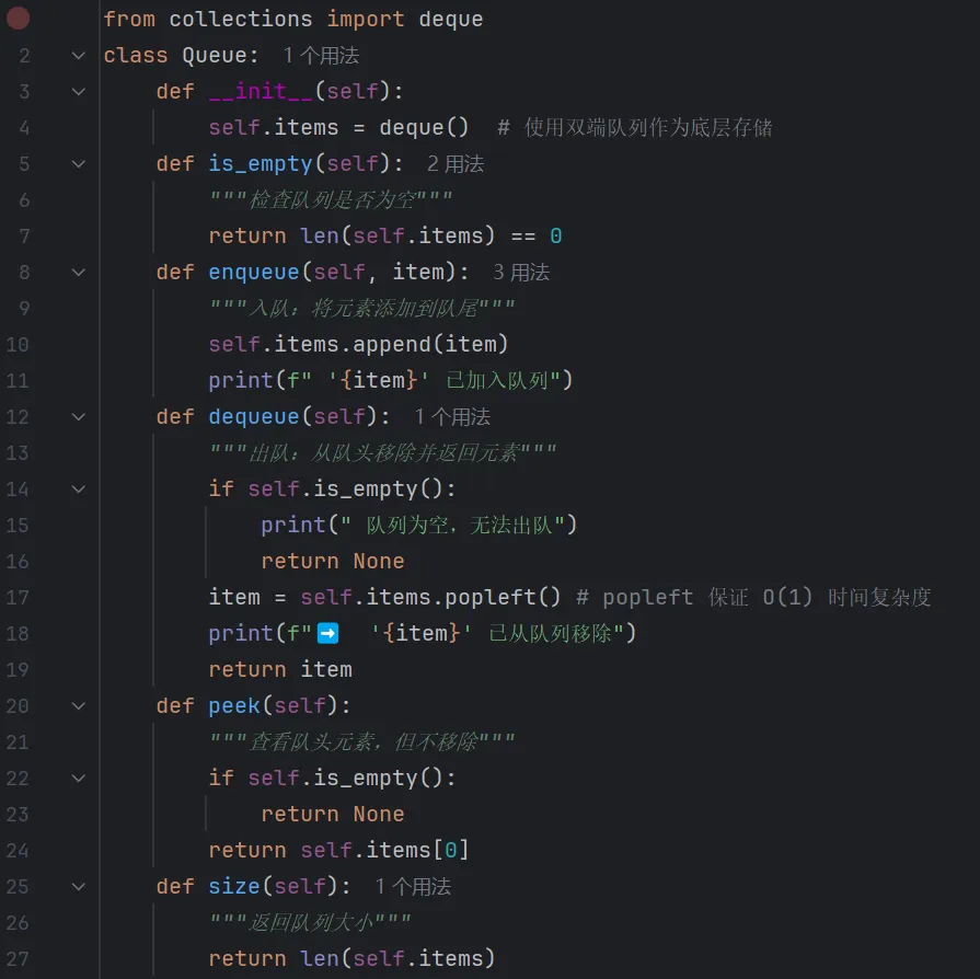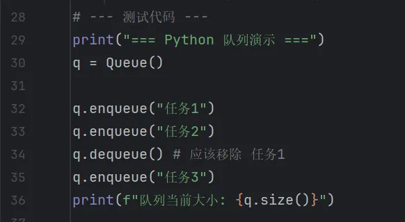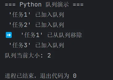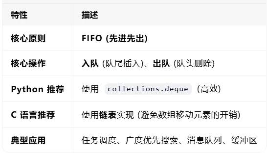 在 Python 中,虽然可以用内置的 list 实现,但为了保证高效的出队操作(避免移动元素),我们通常使用标准库中的 collections.deque。