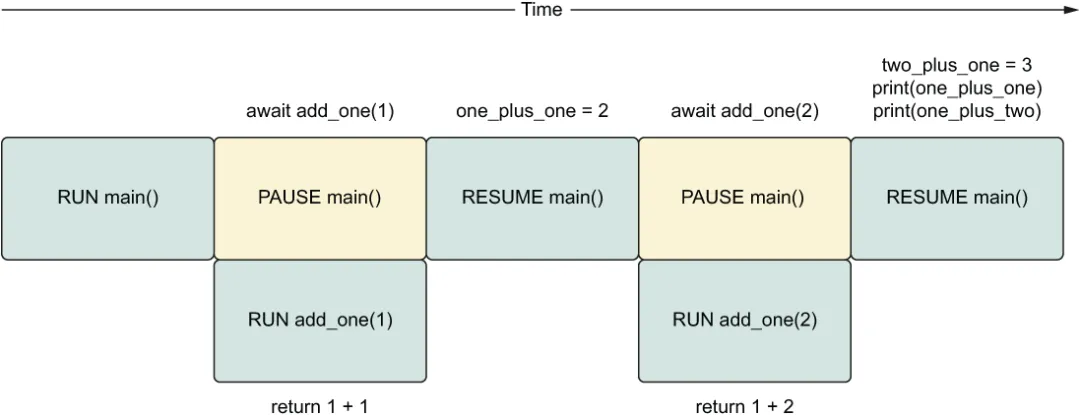 在第 2.4 个示例中,我们暂停了两次执行。我们首先 await 调用 add_one(1)。一旦拿到结果,main 函数就会“恢复”,我们将 add_one(1) 返回的值赋给变量 one_plus_one,在这个例子中就是 2。然后我们对 add_one(2) 做同样的事情,接着打印结果。我们可以把应用程序的执行流程可视化,如图 2.1 所示。图中的每个区块代表某一时刻正在执行的一行或多行代码。