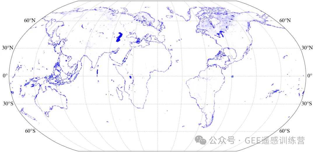 2.全球水体分布制图(JRC-Nature2016):总结:以上这些地图是我们随意生成的,我们打通了遥感云平台数据与本地数据之间的纽带关系,实现了对GEE上数据的任意位置、任意数据的标准化制图,完成了地图制图的最后一个环节,彻底摆脱了GIS软件、遥感数据处理软件(如ENVI)等,实现了快速流程化制图!!!寒假,我们将开启GEE(Python版本)深度学习与全球制图分析实战特训教学,内容包含了GEE在Python的本地环境下各种操作和应用,涵盖了从数据筛选→数据处理→数据分析→数据建模剪→全球数据的可视化制图分析。