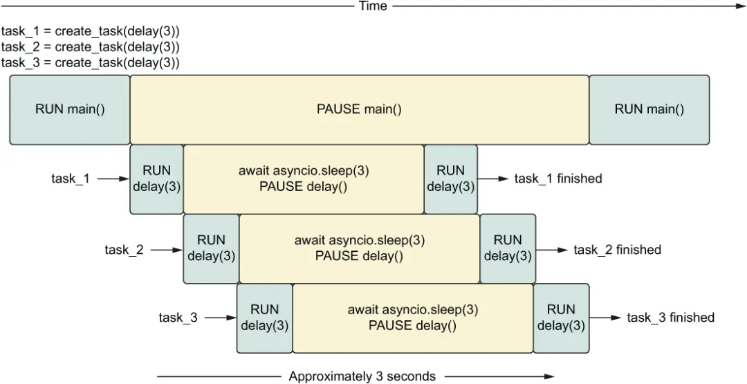 在上面的示例中,我们启动了三个任务,每个都耗时 3 秒。每次调用 create_task 都会立即返回,因此我们很快就到达了 await sleep_for_three 语句。之前我们提到过,任务是“尽可能快”地安排运行的。通常这意味着,第一次遇到 await 语句后,任何待处理的任务都会运行,因为 await 触发了事件循环的一次迭代。