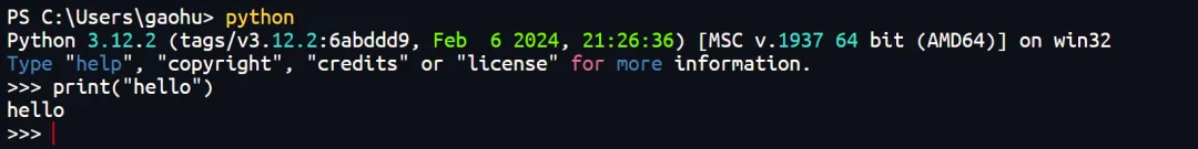看到提示符>>>就表示已经在 Python 交互式环境中,可以输入任何 Python 代码,回车后会立刻得到执行结果。输入exit()并回车,就可以退出 Python 交互式环境(直接关掉命令行窗口也可以)