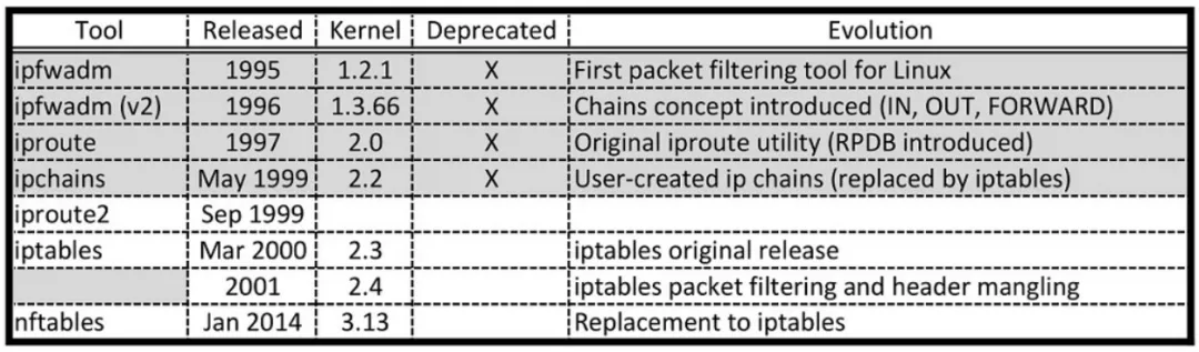 图1: iptables历史时间线首个可配置的Linux防火墙