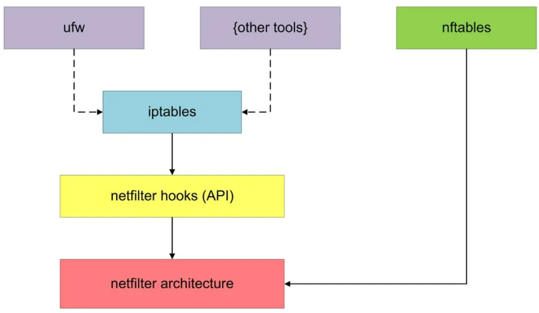 图 2:NetFilter 顶层钩子:NFTables 与 UFW尽管 nftables 未来可能最终取代 iptables,但目前 iptables 仍是事实上的 Linux 防火墙管理工具。无论你选择哪种工具,鉴于 iptables 的广泛应用和深厚根基,短期内它消失的可能性微乎其微。