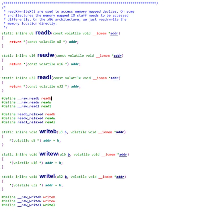 // 读操作u8 readb(constvolatilevoid __iomem *addr); // 8位u16 readw(constvolatilevoid __iomem *addr); // 16位u32 readl(constvolatilevoid __iomem *addr); // 32位// 写操作voidwriteb(u8 value, volatilevoid __iomem *addr);voidwritew(u16 value, volatilevoid __iomem *addr);voidwritel(u32 value, volatilevoid __iomem *addr);