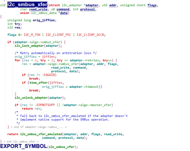 s32 i2c_smbus_read_byte_data(conststruct i2c_client *client, u8 command){ union i2c_smbus_data data; int status; status = i2c_smbus_xfer(client->adapter, client->addr, client->flags, I2C_SMBUS_READ, command, I2C_SMBUS_BYTE_DATA, &data); return (status < 0) ? status : data.byte;}EXPORT_SYMBOL(i2c_smbus_read_byte_data);