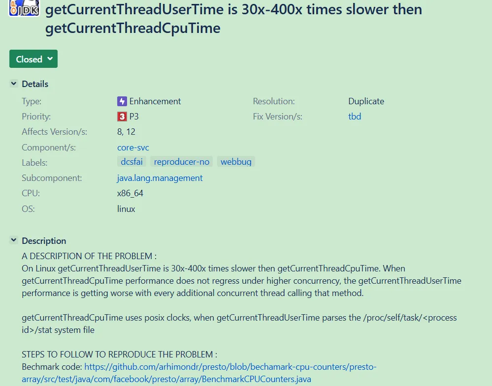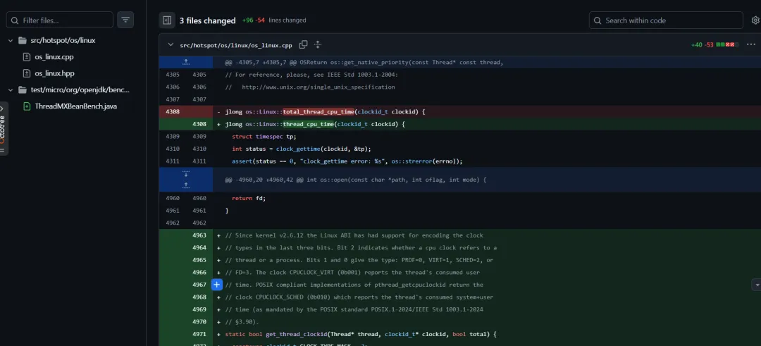 image关键点一句话:Linux 下 ThreadMXBean.getCurrentThreadUserTime() 以前走 /proc 读文件+解析,现在改成 clock_gettime() 一把梭。听着朴实无华,但效果非常“离谱地好”。
