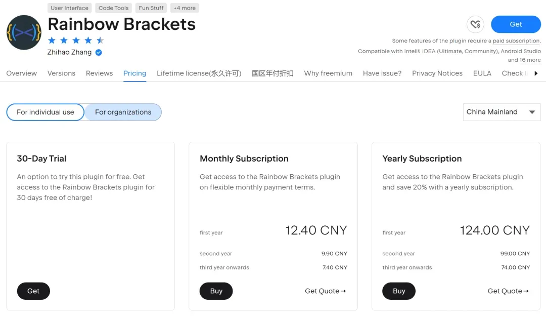 比如,最方便的彩虹括号符Rainbow Brackets,124/年。