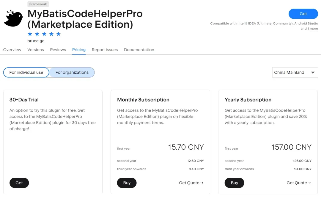 Rainbow Brackets再如,MyBatis最佳辅助框架MyBatisCodeHelperPro的官方版本MyBatisCodeHelperPro (Marketplace Edition),157/年。