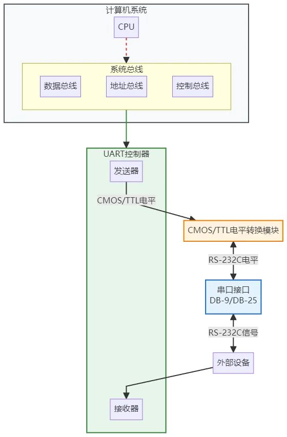 从硬件原理来看,一个完整的RS-232C串口电路,要经过CPU→UART(通用异步接收器发送器,负责并/串转换)→电平转换(CMOS/TTL转RS-232C电平)→DB9/DB25连接器的流程,最终实现数据传输。