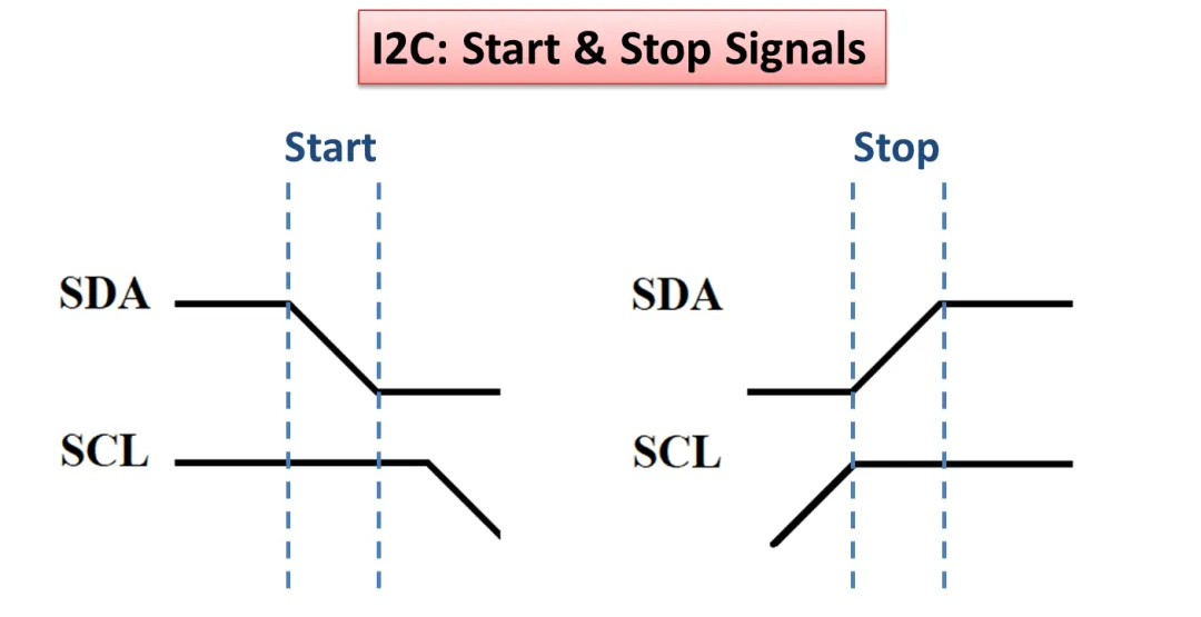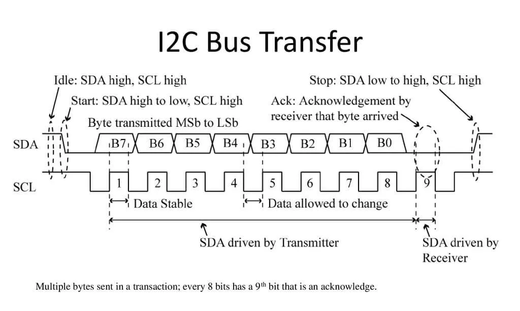 数据传输的关键是“开始位”和“停止位”:当SCL稳定在高电平时,SDA由高变低是开始位,由低变高是停止位,这两个信号都由主设备产生。如果是7位地址的从设备,主设备会先发送1字节地址(前7位地址+最后1位读写标志),之后每次传1字节数据,每传完1字节,接收方要在SCL的第9个上升沿前发一个ACK位确认,确保数据传输准确。