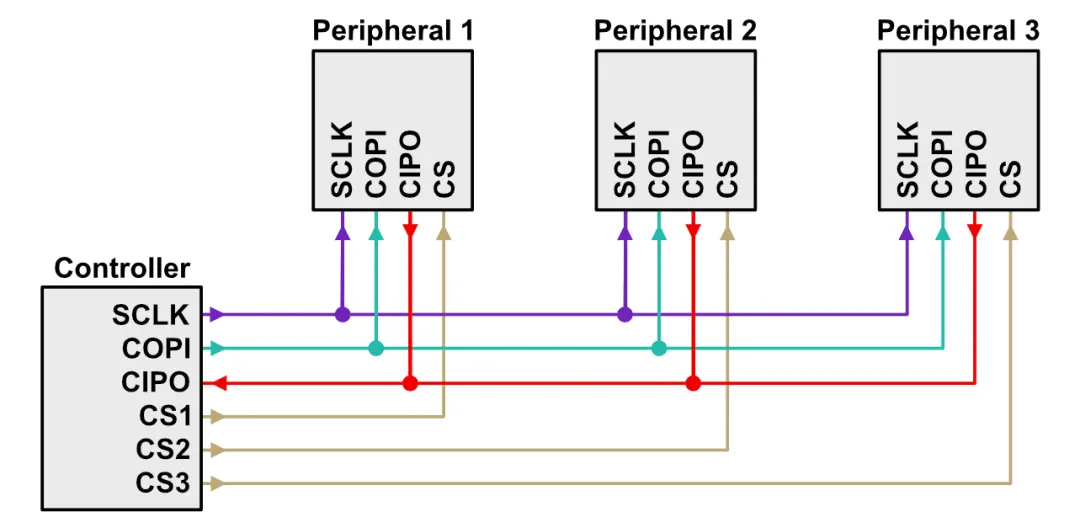 典型的SPI连接场景是1个主设备连接多个从设备,通过不同的SS线区分各个从设备,数据传输时互不干扰,效率很高。