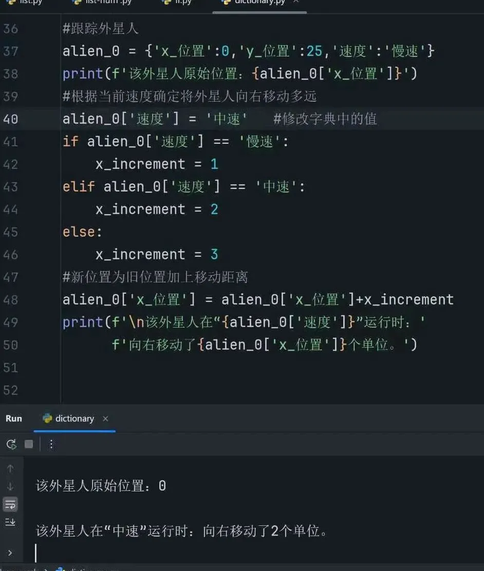 通过修改字典中值(外星人的速度),得到外星人移动的单位。