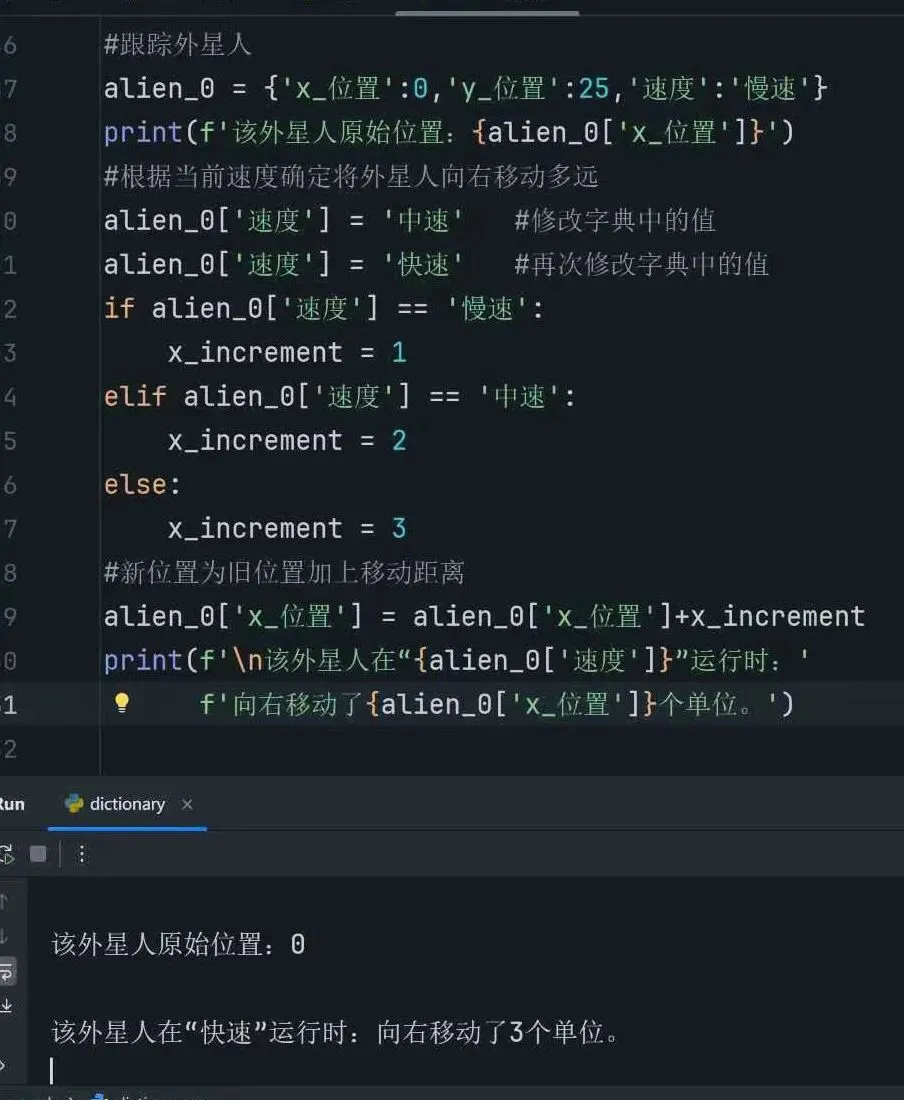 1.定义一个字典,存储外星人的当前位置和速度。
