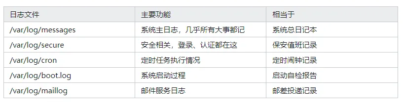 日志是系统运行的“黑匣子”,记录了系统的一举一动。不同的日志文件就像是不同主题的日记本:2.1 日志家族一览表