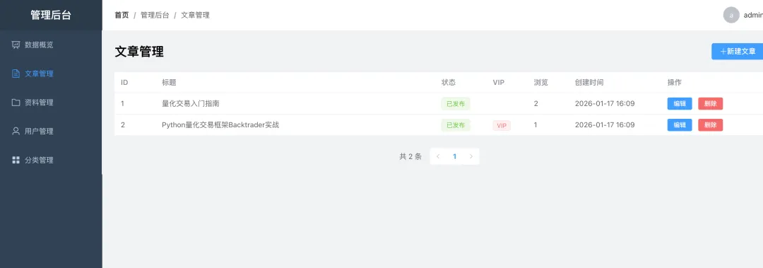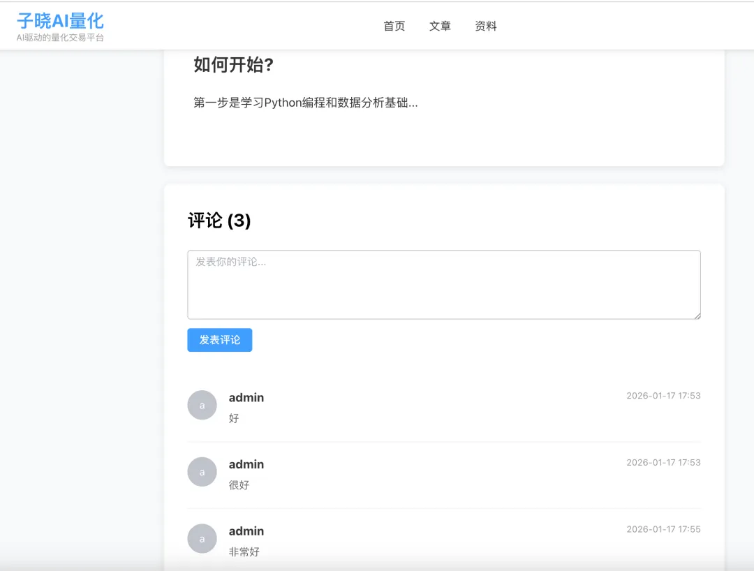 最近1、2个月,知识星球上传的一些内容经常莫名其妙因为一些原因被平台无缘无故的删除。 群里同学建议我可以自己做一个网站, 免除这种限制。 周末趁着有空, 用AI编程试着撸一把找一找感觉。先做一个玩具, 看看AI编程到底能不能帮我把需求实现掉。 网站暂时没上线,看我从0开始不敲1行代码实现这样的一个网站。1、C端可以查看文章评论、下载资料(区分普通会员还是VIP)2、B端进行用户管理、文章管理、资料管理等基础功能。说下技术框架, 数据库用的mysql, 缓存redis, 后端用的python框架fastapi, 前端用的vue框架。暂时没考虑部署线上, 主要是考虑到网络宽带、 好一点的服务器(搭建数据库、缓存、前后端应用等), 1年至少万把块钱。 如果没啥用户就先不折腾买服务器了。说下我用的编程工具, 用的智谱zcode + GLM 4.7 实现。全程没写一行代码。🚀 速来拼好模,智谱 GLM Coding 超值订阅,邀你一起薅羊毛!Claude Code、Cline 等 20+ 大编程工具无缝支持,“码力”全开,越拼越爽!立即开拼,享限时惊喜价!