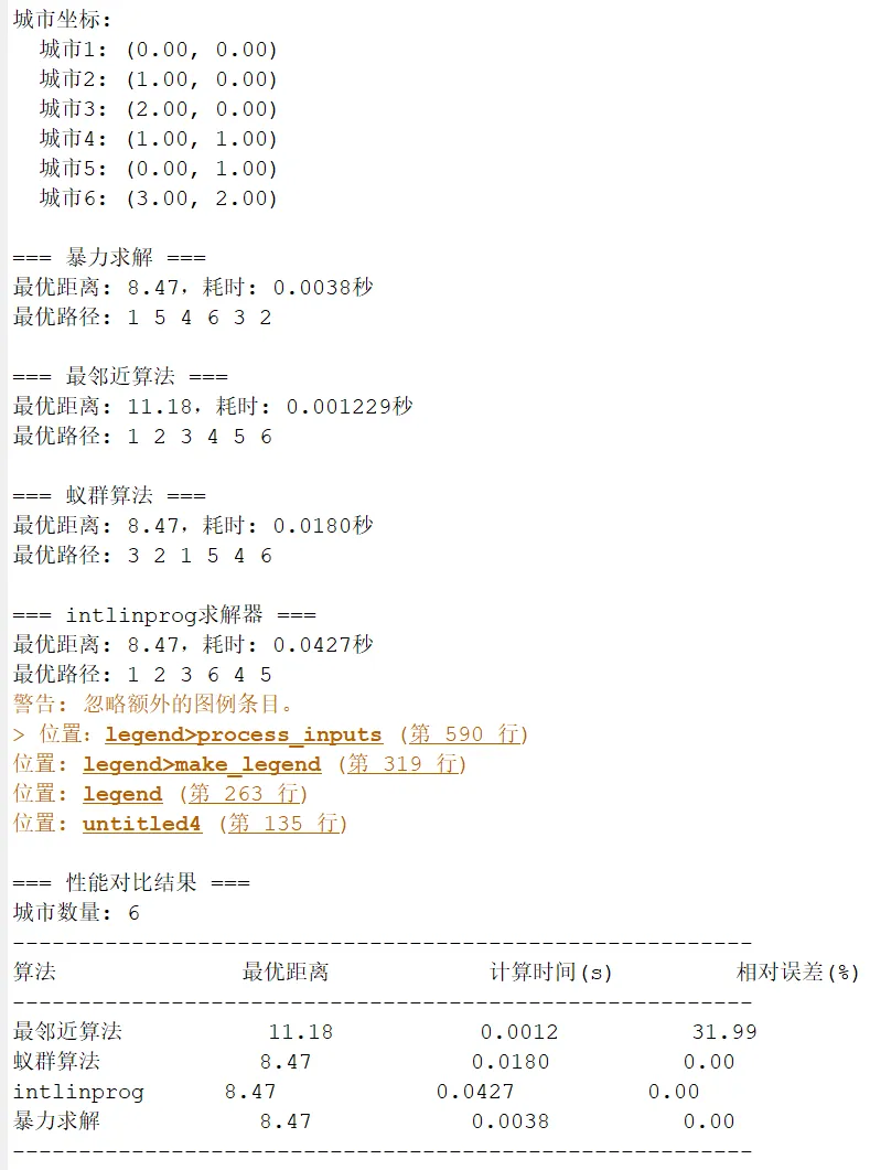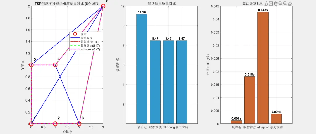 %% TSP问题:多种算法对比分析% 功能:对比暴力求解、最邻近算法、蚁群算法和intlinprog求解器clear; clc; close all;%% 参数设置n_cities = 6; % 城市数量(建议4-6,确保所有算法都能运行)%% 生成城市坐标rng(42); % 设置随机种子以保证结果可重现if n_cities == 6cities_x = [0, 1, 2, 1, 0, 3];cities_y = [0, 0, 0, 1, 1, 2];elseif n_cities == 5cities_x = [0, 2, 4, 2, 0,];cities_y = [0, 0, 2, 2, 2];else % 随机分布 cities_x = rand(n_cities, 1) * 10; cities_y = rand(n_cities, 1) * 10;end%% 计算距离矩阵distance_matrix = zeros(n_cities, n_cities);for i = 1:n_cities for j = 1:n_cities if i ~= j distance_matrix(i,j) = sqrt((cities_x(i)-cities_x(j))^2 + ... (cities_y(i)-cities_y(j))^2); else distance_matrix(i,j) = inf; % 避免自循环 end endendfprintf('=== TSP问题设置 ===\n');fprintf('城市数量: %d\n', n_cities);fprintf('城市坐标:\n');for i = 1:n_cities fprintf(' 城市%d: (%.2f, %.2f)\n', i, cities_x(i), cities_y(i));end%% 方法1:暴力求解(精确算法)fprintf('\n=== 暴力求解 ===\n');if n_cities <= 8 % 暴力求解限制在8个城市以内 [best_route_brute, best_distance_brute, time_brute] = solve_brute_force(distance_matrix);else fprintf('城市数过多,跳过暴力求解\n'); best_route_brute = []; best_distance_brute = NaN; time_brute = NaN;end%% 方法2:最邻近算法(贪心算法)fprintf('\n=== 最邻近算法 ===\n');[best_route_nn, best_distance_nn, time_nn] = solve_nearest_neighbor(distance_matrix);%% 方法3:蚁群算法(启发式算法)fprintf('\n=== 蚁群算法 ===\n');[best_route_aco, best_distance_aco, time_aco] = solve_aco(distance_matrix);%% 方法4:intlinprog求解器fprintf('\n=== intlinprog求解器 ===\n');if license('test', 'Optimization_Toolbox') && n_cities <= 6 [best_route_exact, best_distance_exact, time_exact, exact_success] = solve_tsp_practical(distance_matrix); if ~exact_success fprintf('intlinprog求解失败\n'); best_route_exact = []; best_distance_exact = NaN; time_exact = NaN; endelse if ~license('test', 'Optimization_Toolbox') fprintf('未安装MATLAB优化工具箱,跳过intlinprog求解\n'); else fprintf('城市数过多,跳过intlinprog求解\n'); end best_route_exact = []; best_distance_exact = NaN; time_exact = NaN;end%% 结果可视化figure('Position', [100, 100, 1400, 600]);% 子图1:城市分布和路径对比subplot(1, 3, 1);plot(cities_x, cities_y, 'ro', 'MarkerSize', 12, 'LineWidth', 2);hold on;% 标注城市编号for i = 1:n_cities text(cities_x(i)+0.1, cities_y(i)+0.1, num2str(i), 'FontSize', 12, 'FontWeight', 'bold');end% 绘制各种算法结果legend_items = {'城市', '城市编号'};% 最邻近算法(蓝色)if ~isempty(best_route_nn) route_x_nn = cities_x([best_route_nn, best_route_nn(1)]); route_y_nn = cities_y([best_route_nn, best_route_nn(1)]); plot(route_x_nn, route_y_nn, 'b-', 'LineWidth', 1.5); legend_items{end+1} = sprintf('最邻近(%.2f)', best_distance_nn);end% 蚁群算法(红色)if ~isempty(best_route_aco) route_x_aco = cities_x([best_route_aco, best_route_aco(1)]); route_y_aco = cities_y([best_route_aco, best_route_aco(1)]); plot(route_x_aco, route_y_aco, 'r-.', 'LineWidth', 2); legend_items{end+1} = sprintf('蚁群算法(%.2f)', best_distance_aco);end% intlinprog(绿色)if ~isempty(best_route_exact) route_x_exact = cities_x([best_route_exact, best_route_exact(1)]); route_y_exact = cities_y([best_route_exact, best_route_exact(1)]); plot(route_x_exact, route_y_exact, 'g--', 'LineWidth', 1.5); legend_items{end+1} = sprintf('intlinprog(%.2f)', best_distance_exact);end% 暴力求解(品红)if ~isempty(best_route_brute) route_x_brute = cities_x([best_route_brute, best_route_brute(1)]); route_y_brute = cities_y([best_route_brute, best_route_brute(1)]); plot(route_x_brute, route_y_brute, 'm:', 'LineWidth', 2); legend_items{end+1} = sprintf('暴力求解(%.2f)', best_distance_brute);endxlabel('X坐标');ylabel('Y坐标');title(sprintf('TSP问题多种算法求解结果对比 (%d个城市)', n_cities));legend(legend_items, 'Location', 'best');grid on;% 子图2:算法性能对比(距离)subplot(1, 3, 2);algorithms = {'最邻近', '蚁群算法', 'intlinprog', '暴力求解'};distances = [best_distance_nn, best_distance_aco, best_distance_exact, best_distance_brute];times = [time_nn, time_aco, time_exact, time_brute];% 只显示有效的算法valid_distances = distances(~isnan(distances));if ~isempty(valid_distances) best_known = min(valid_distances); valid_algorithms = {}; valid_distances_plot = []; valid_times_plot = []; if ~isnan(best_distance_nn) valid_algorithms{end+1} = '最邻近'; valid_distances_plot(end+1) = best_distance_nn; valid_times_plot(end+1) = time_nn; end if ~isnan(best_distance_aco) valid_algorithms{end+1} = '蚁群算法'; valid_distances_plot(end+1) = best_distance_aco; valid_times_plot(end+1) = time_aco; end if ~isnan(best_distance_exact) valid_algorithms{end+1} = 'intlinprog'; valid_distances_plot(end+1) = best_distance_exact; valid_times_plot(end+1) = time_exact; end if ~isnan(best_distance_brute) valid_algorithms{end+1} = '暴力求解'; valid_distances_plot(end+1) = best_distance_brute; valid_times_plot(end+1) = time_brute; end bar(1:length(valid_distances_plot), valid_distances_plot, 'FaceColor', [0.2, 0.6, 0.8]); set(gca, 'XTick', 1:length(valid_distances_plot), 'XTickLabel', valid_algorithms); ylabel('最短距离'); title('算法结果质量对比'); grid on; % 在柱状图上标注数值 for i = 1:length(valid_distances_plot) text(i, valid_distances_plot(i) + max(valid_distances_plot)*0.02, ... sprintf('%.2f', valid_distances_plot(i)), ... 'HorizontalAlignment', 'center', 'FontWeight', 'bold'); endend% 子图3:时间对比subplot(1, 3, 3);if exist('valid_times_plot', 'var') && ~isempty(valid_times_plot) bar(1:length(valid_times_plot), valid_times_plot, 'FaceColor', [0.8, 0.4, 0.2]); set(gca, 'XTick', 1:length(valid_times_plot), 'XTickLabel', valid_algorithms); ylabel('计算时间 (秒)'); title('算法计算时间对比'); 
