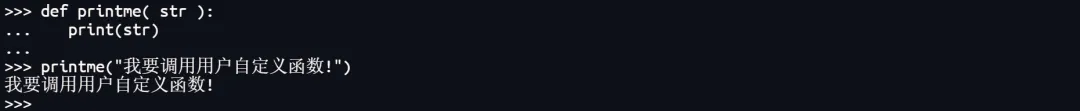 # 定义函数def printme(str): print(str)# 调用函数printme("我要调用用户自定义函数!")