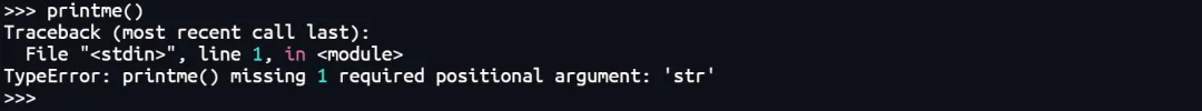 # 必备参数函数def printme(str): print(str)# 调用 printme 函数,不传参数会报错printme()