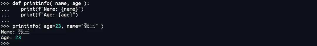 # 关键字参数函数def printinfo( name, age ): print(f"Name: {name}") print(f"Age: {age}")# 调用 printinfo 函数printinfo( age=23, name="张三" )