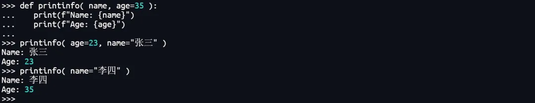 # 默认值参数函数def printinfo( name, age=35): print(f"Name: {name}") print(f"Age: {age}")# 调用 printinfo 函数printinfo( age=23, name="张三" )printinfo( name="李四" )