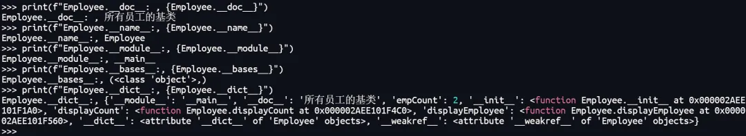 __dict__ | 类的属性(包含一个字典,由类的数据属性组成) |