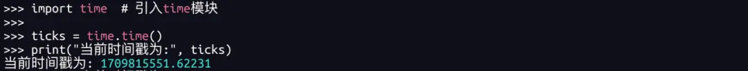 import time # 引入time模块ticks = time.time()print("当前时间戳为:", ticks)