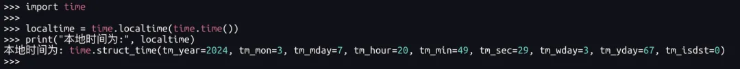 import timelocaltime = time.localtime(time.time())print("本地时间为:", localtime)