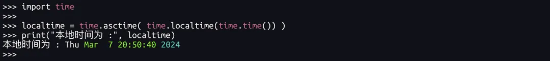 import timelocaltime = time.asctime( time.localtime(time.time()) )print("本地时间为 :", localtime)