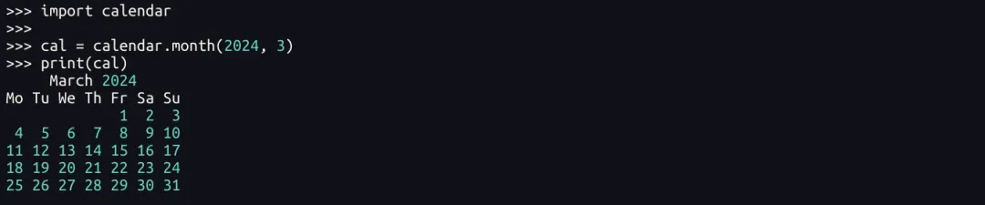 import calendarcal = calendar.month(2024, 3)print(cal)
