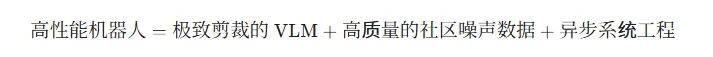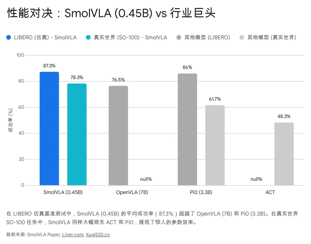 数据解读: 一个参数量仅为 OpenVLA 1/15 的模型,在任务成功率上反超了 10.8%。这强有力地证明了架构优化(层跳过、流匹配)和数据质量(社区多样性数据)比单纯堆叠参数更有效 16。