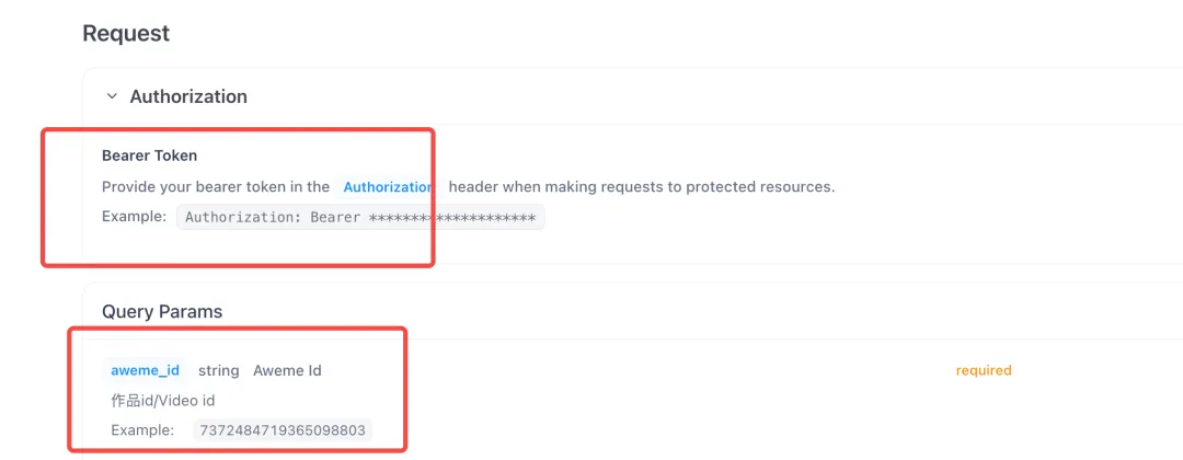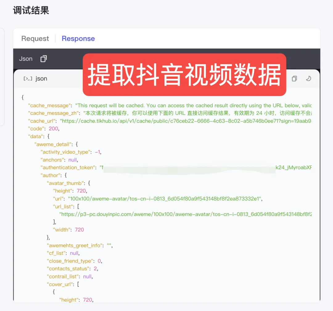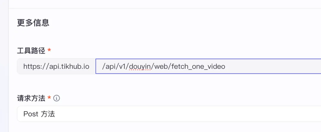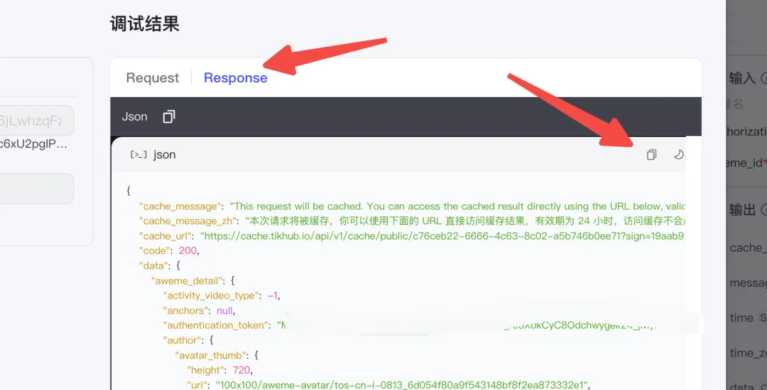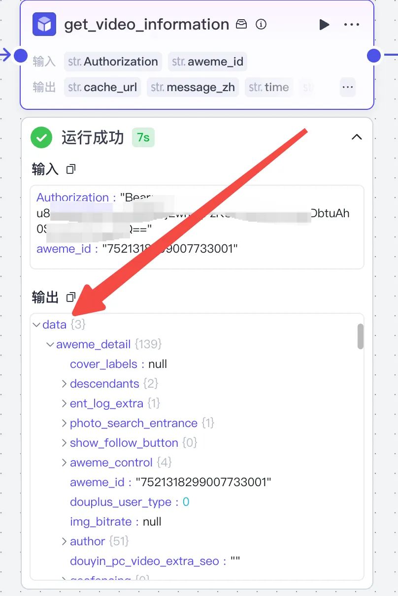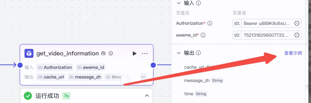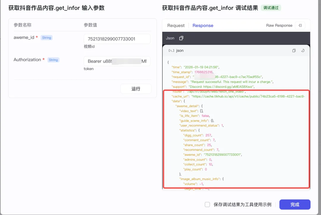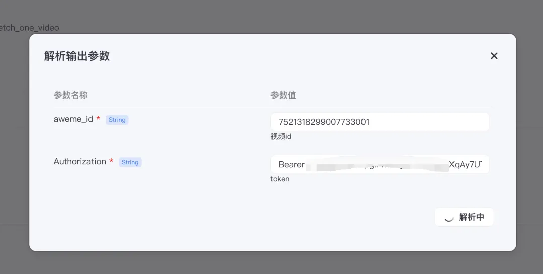 输入参数这里我们要配置两个参数,一个是文档当中写的抖音视频的ID,另外一个是在这个第三方网站的token密钥