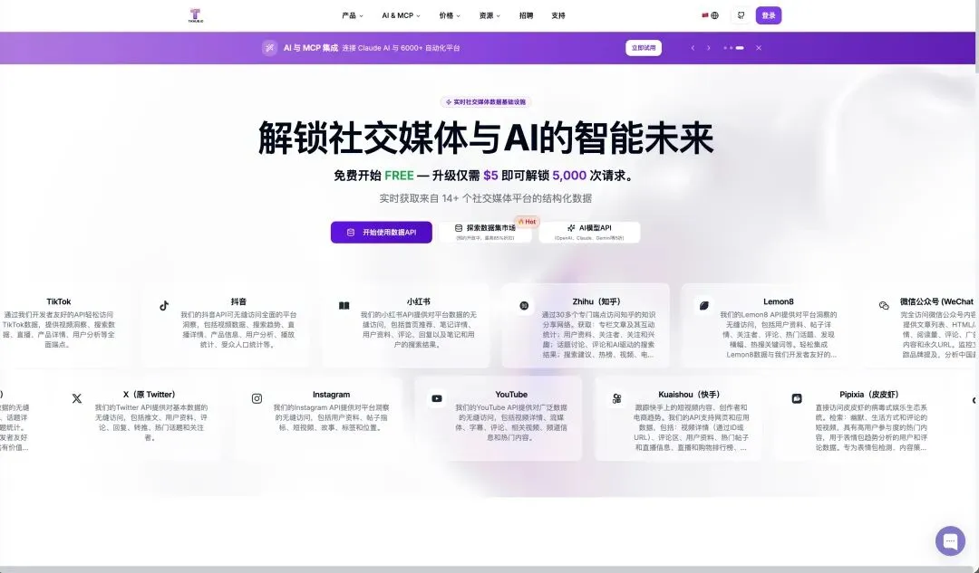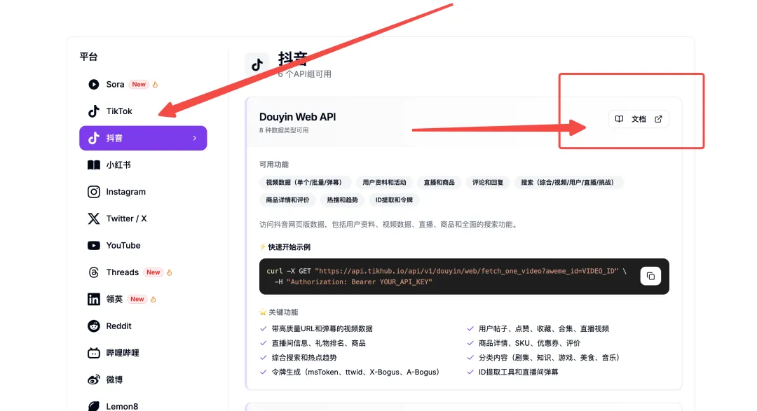 先给大家分享一个网站,这一期的插件教学就会从这个网站拿第三方的API用于演示https://tikhub.io/ 里面集成了很多第三方API服务,我们去付费调用,教程里演示所造成的几次调用,免费额度完全够用,我都没有充值一分钱