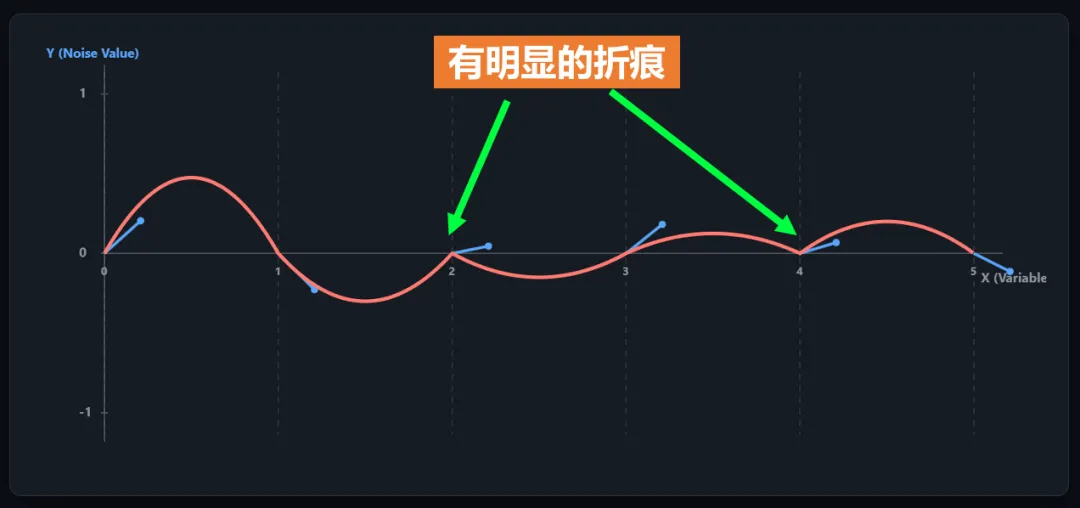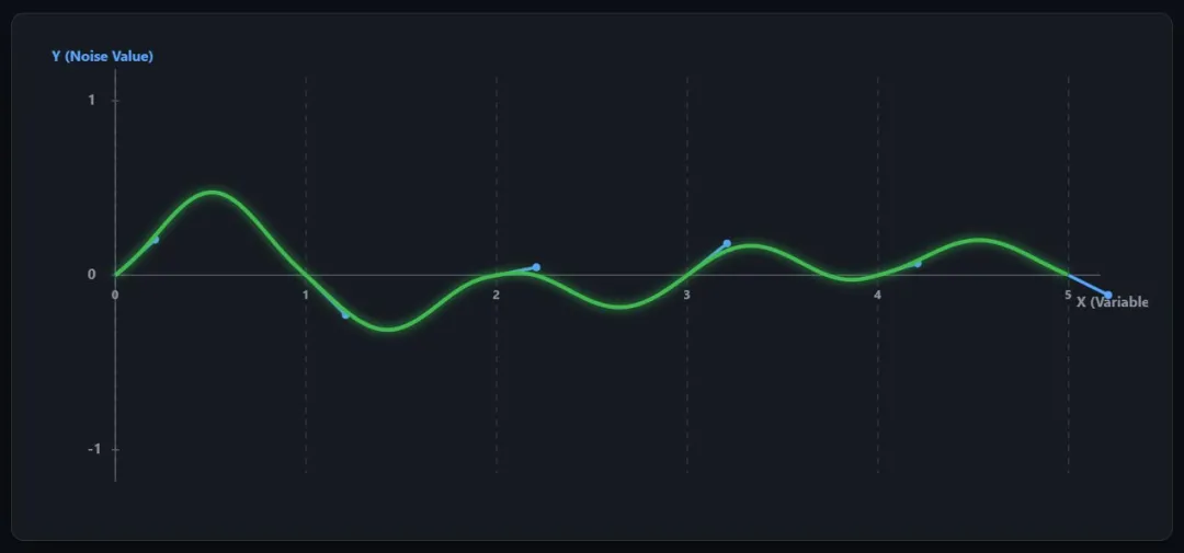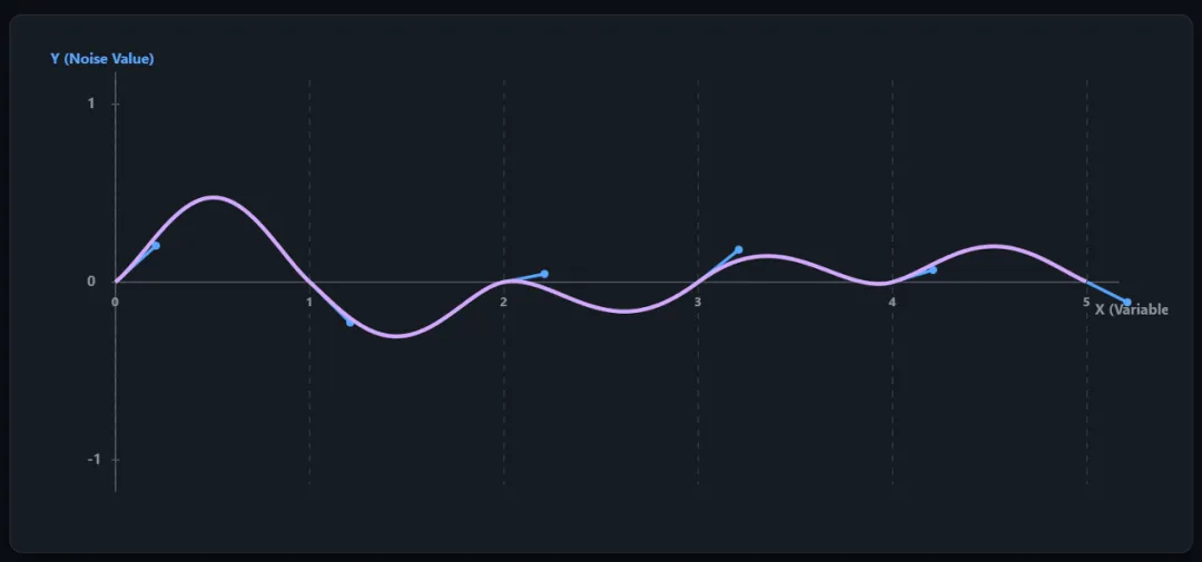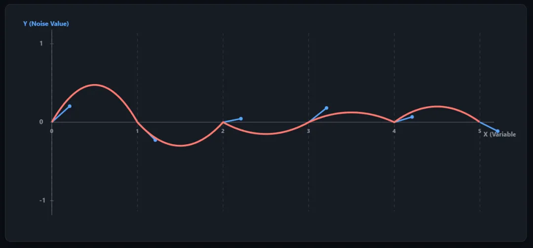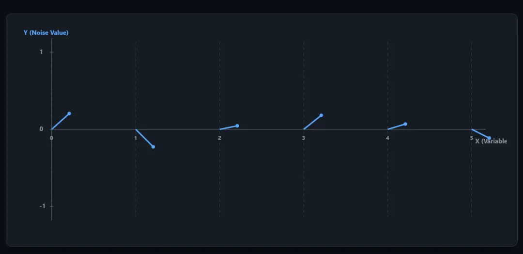我们从1D噪声开始。想象一个平面坐标轴,x轴代表变量(比如时间或距离),y轴的值就是对应的一维噪声值。我们首先在x轴上标记出0、1、2等整数格点,并为每个点随机指定一个-1到1之间的数值。这个数值代表函数经过该点时的斜率,也就是我们常说的“梯度”。
