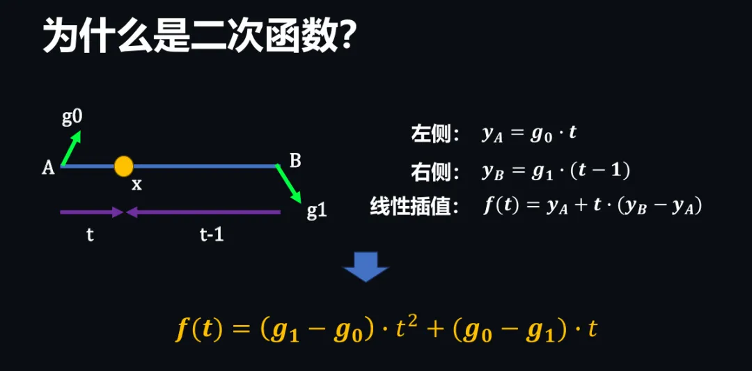 我们取x轴的一段来讲解:左侧为A点,右侧为B点,当前采样点位于A、B之间。A点处的梯度g0对采样点的位移贡献为t,B点处的梯度g1贡献则为t-1。此时,左侧贡献值yA=g0*t,右侧贡献值yB=g1*(t-1)。将这两个值代入插值公式f(t)=(1-t)*yA+t*y_B展开整理后,你会发现它确实是一个关于t的二次函数。这也就是为什么它的轨迹是一条抛物线。