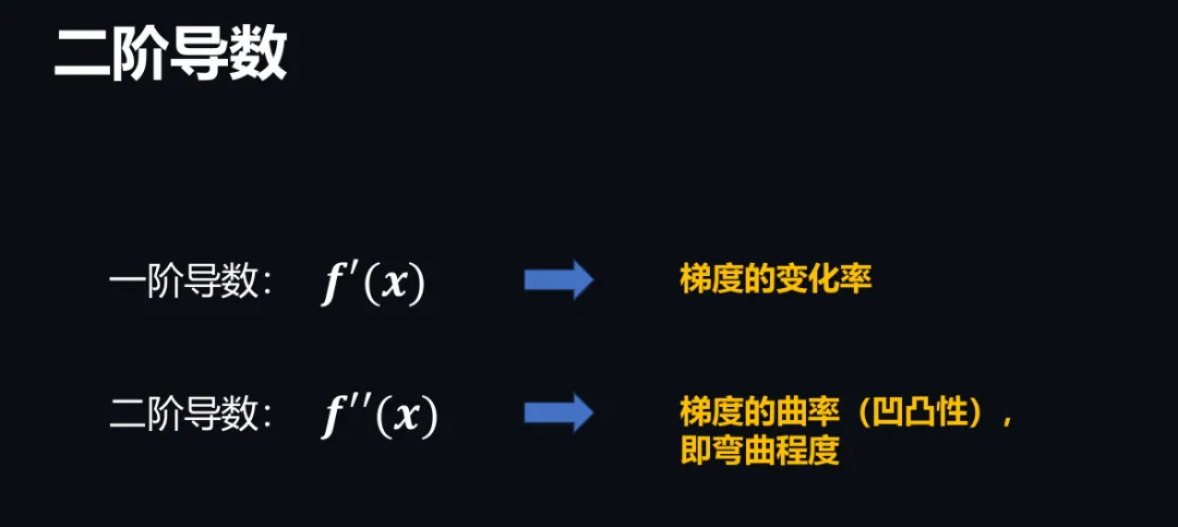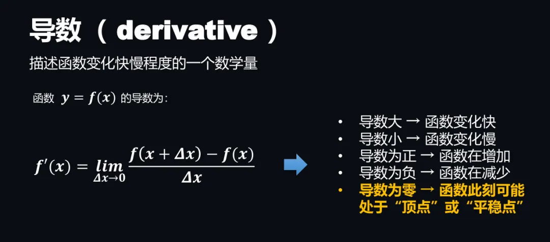 导数是描述函数变化快慢的数学量。刚才提到的“折痕”,本质上就是导数在衔接瞬间发生了突变。函数y= f(x)的导数公式如下(展示极限定义公式),简单来说,它就是y的变化量除以x的变化量。当x的变化量趋近于零时,得到的就是该时刻的瞬时变化率。导数的正负和大小反映了函数的增减方向和变化快慢。特别需要注意的是:当导数为0时,函数处于平稳点,比如二次函数的顶点。这给了我们启示:如果我们希望曲线在交汇点实现平滑衔接,那么在交汇瞬间,它的导数为0是最理想的状态。