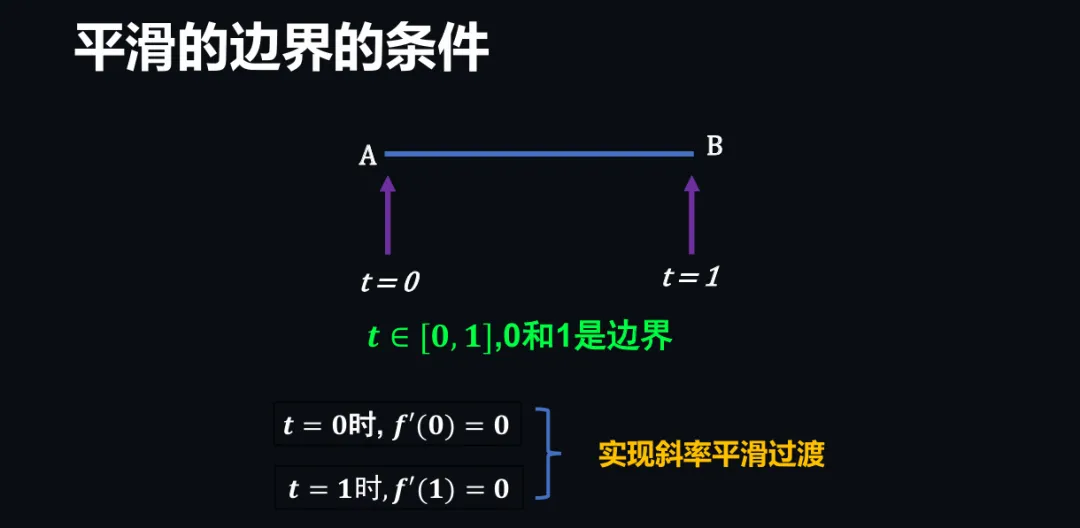 因此,实现平滑边界的条件就是:在AB区间的边界(即t=0和t=1处),插值函数的导数必须为零。