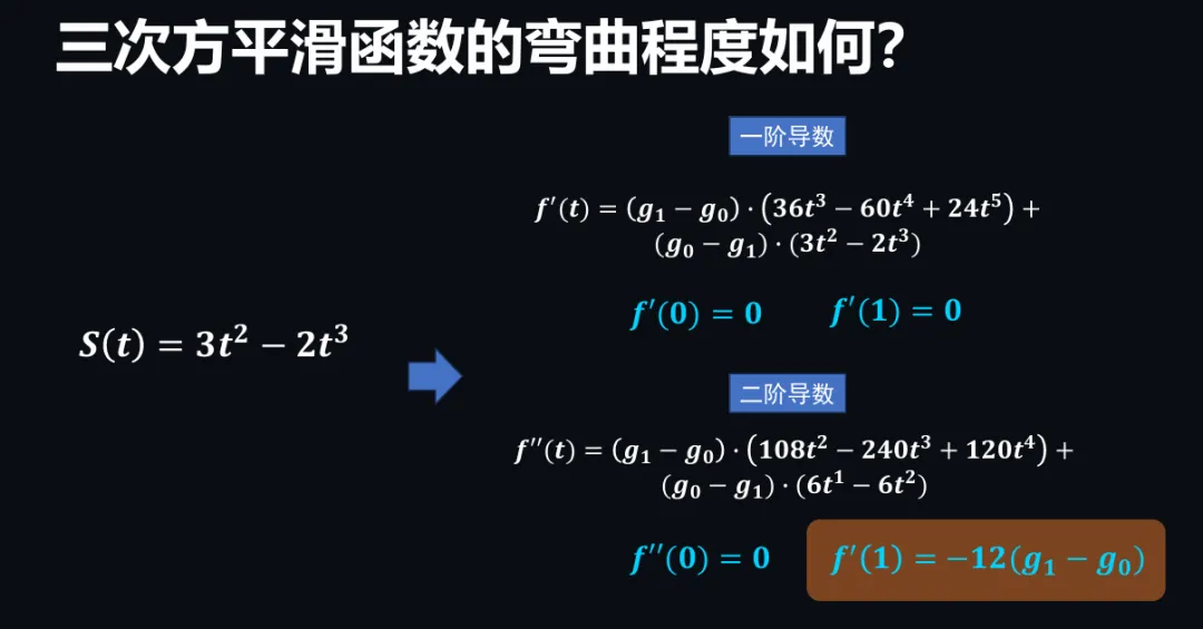 我们来看看三次函数的表现:它的一阶导数在边界虽然为0,但二阶导数在t=1处却是-12*(g1-g0)。这意味着除非g1等于g0,否则弯曲程度在衔接处依然会发生突跳。