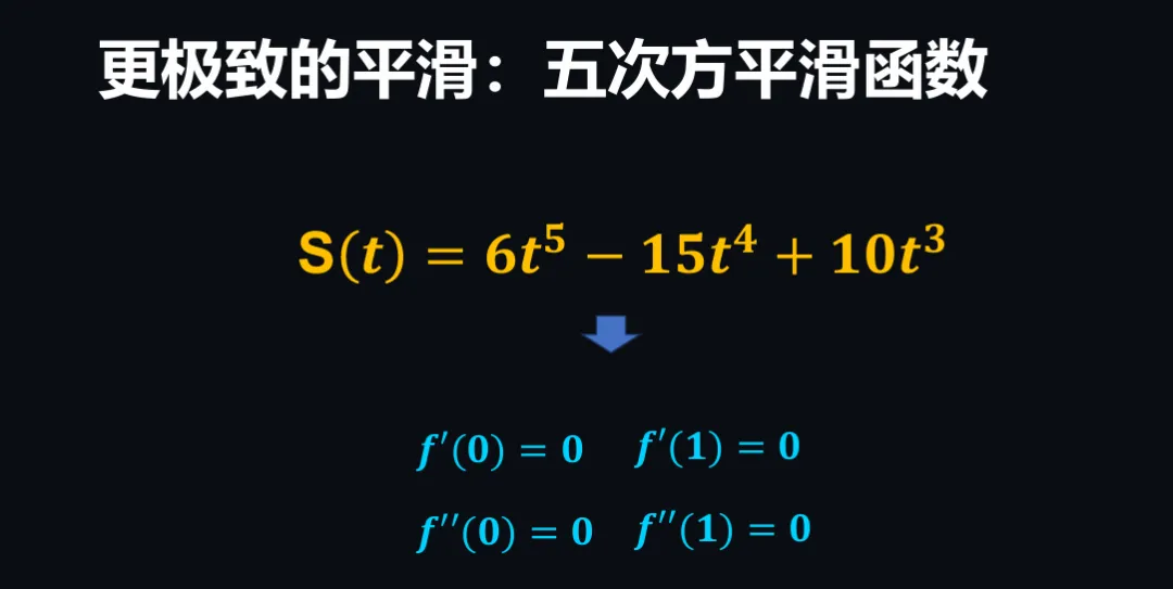 这里我们要引入“平滑函数”的概念。在代码调用插值时,通常传入三个参数:左侧贡献、右侧贡献和当前t值。核心就在这个t值上。如果我们直接使用线性插值,实际传入的平滑函数就是S(t)=t。现在我们对其求导,代入边界发现:当t=0时,导数值为g0-g1;当t=1时,导数值为g1-g0。除非两点梯度完全相等,否则导数几乎不可能为0。这从数学上证明了,直接使用S(t) =t无法实现边界的平滑衔接。
