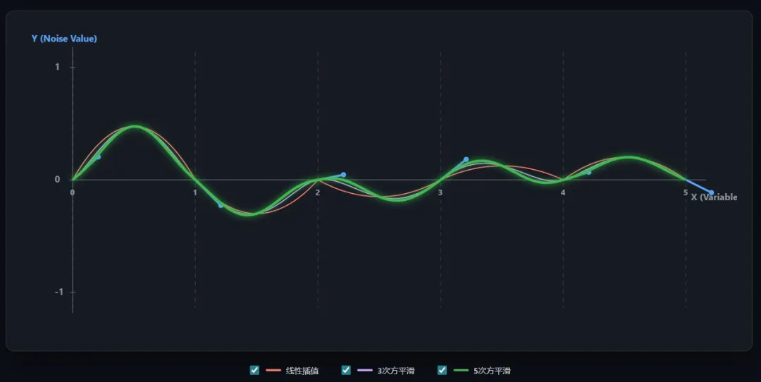 聪明的你一定想到了:难道我们不能换一个更高级的平滑函数吗?思路完全正确!早期柏林噪声采用了S(t) =3t^2-2t^3,也就是“三次方平滑函数”。我们将这个函数代入插值公式后求导,发现它在t=0和t=1处的导数确实都变成了0。这完美达成了平滑衔接的目的。