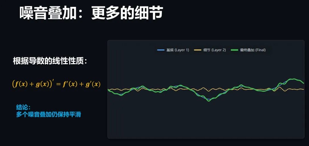 此外,不同的柏林噪声是可以直接叠加的。根据导数的线性性质,两个平滑函数相加后的导数,等于它们各自导数的和。因此,多个平滑噪声叠加后的结果依然是极致平滑的。我们可以利用不同振幅、频率的波形叠加出具有丰富细节的曲线,如绿色曲线所示。