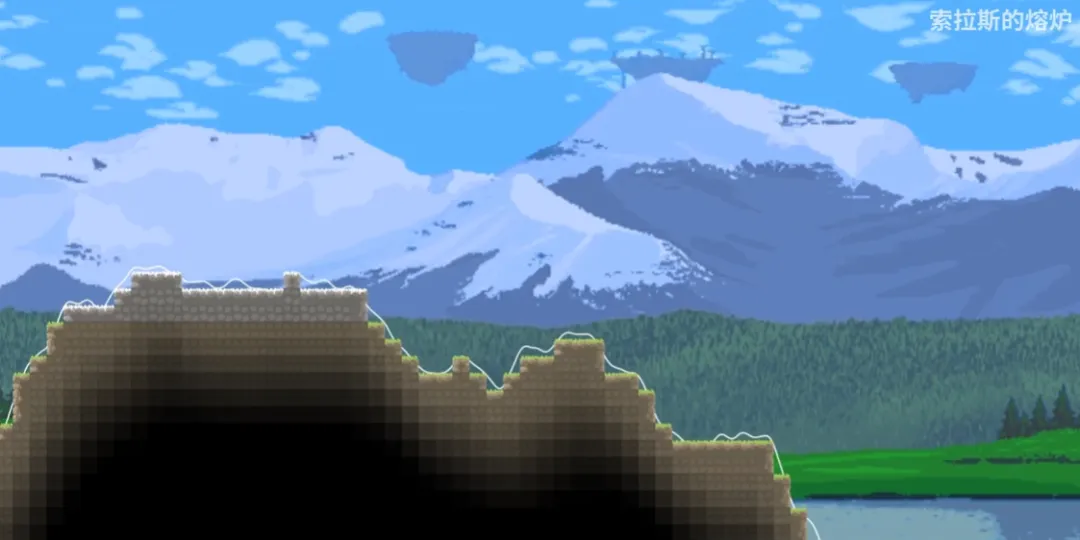 综合运用一维柏林噪声,我们可以生成类似《泰拉瑞亚》这种横版游戏的地形。可以看到,生成的地貌非常优雅自然。