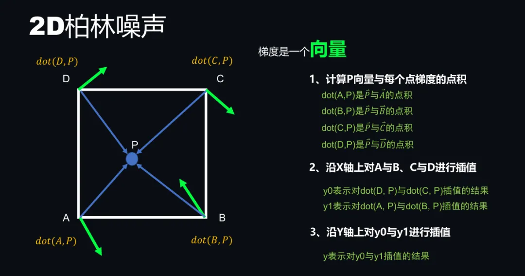 理解了1D,2D就非常容易了。在2D平面中,我们划分出很多网格。如果采样点P处在网格ABCD中,它会受到4个格点梯度的共同影响。此时梯度变为了“向量”,我们使用“点积”来计算每个梯度对P点的贡献。接着,先沿着x轴在AB和CD之间进行两次插值,最后再沿着 y轴进行最后一次插值。相比1D,2D噪声涉及4个顶点和总共3次插值运算。