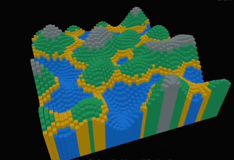 甚至,我们可以将2D噪声映射到3D空间的高度轴上,从而生成起伏的3D山峦。