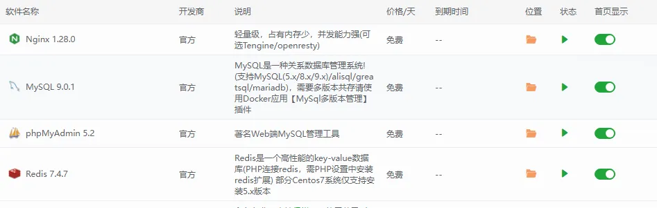 装好后,面板首页会显示各服务状态,确保都是“运行中”。